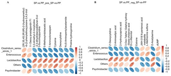 Correlation analysis of the differential metabolites in the feces. (A): Correlation analysis results of the differential metabolites in the feces of the SP and PP groups in positive ion mode. (B): Correlation analysis results of the differential metabolites in the feces of the SP and PP groups in negative ion mode. An asterisk (*) indicates significant relevance in the correlation analysis.