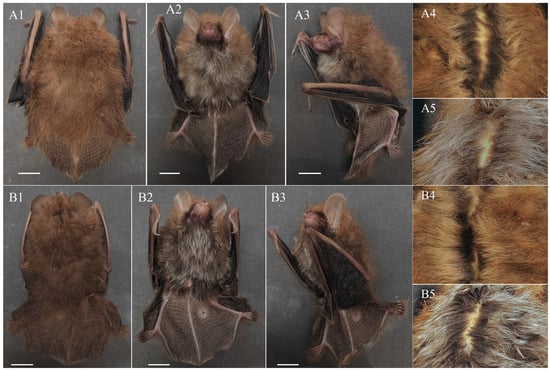 External morphology of Murina Lvchun Xin Mou & Song Li, sp. nov. (A) Holotype; (B) paratype. Dorsal (1), ventral (2) and lateral (3) views of unprocessed specimens; dorsal (4) and ventral (5) close-up photographs of stuffed specimens made after alcohol immersion. Scale = 10 mm.