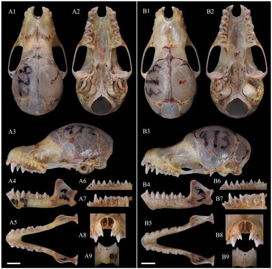 Skull of Murina lvchun Xin Mou & Song Li, sp. nov. (A) Holotype; (B) paratype. Dorsal (1), ventral (2) and lateral (3) views of the skull; lateral (4) and occlusal (5) views of the mandible; lingual view of the mandibular (6) and maxillary (7) dentition; labial view of the upper (8) and lower (9) incisors and canines. Scale = 2 mm.