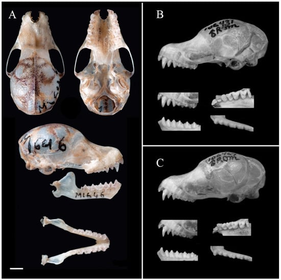 Skulls from principal species within the Murina genus for comparative analysis, sourced from the literature: (A) M. pluvialis (Ruedi et al. [29]); (B) M. cyclotis (Francis and Eger [30]); (C) M. annamitica (Francis and Eger [30]). Scale = 2 mm.