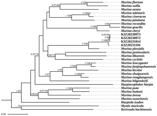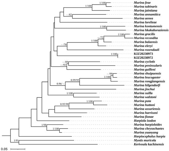 Maximum-likelihood phylogenetic tree of Murina species based on Cyt b fragments. Node numbers before “/” indicate Bayesian posterior probabilities (values below 0.90 not shown), and numbers after “/” indicate ultrafast bootstrap support in maximum-likelihood analyses (values below 70 not shown).