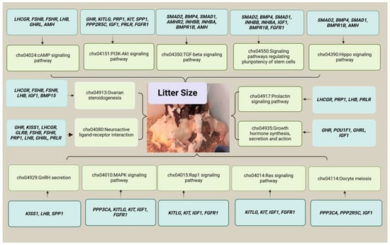 Kyoto Encyclopedia of Genes and Genomes (KEGG) signaling pathways linked to reproductive performance and litter size in goats. Here, it is important to note that this figure is based on speculative information rather than confirmed data, so the relationships shown should be interpreted carefully.