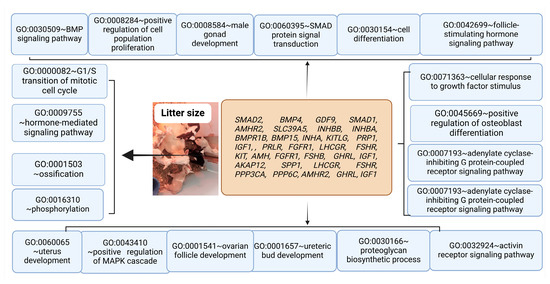 Biological functional processes linked to reproductive performance and litter size. Figure 3 illustrates the biological processes associated with genes influencing litter size. Key functional processes identified include suppressor of mothers against decapentaplegic (SMAD) protein signal transduction, cell differentiation, bone morphogenetic proteins (BMP) signaling pathway, follicular development, and the transition of the mitotic cell cycle, among others.