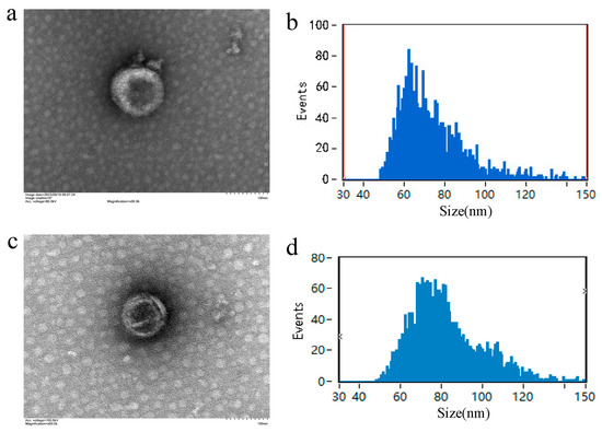 First, a 1 mL volume of exosome sample was carefully layered onto 250 μL of a 30% sucrose cushion and centrifuged at 100,000× g for 70 min. Following centrifugation, 250 μL of the 30% sucrose cushion, located at the bottom, was carefully removed. This was diluted with PBS to 3 mL and centrifuged again at 100,000× g for 70 min, and the supernatant was then discarded. The precipitation was resuspended in 200 μL of pre-cooled PBS. An amount of 20 μL was used for electron microscopy imaging, 10 μL was used for nanoparticle size analysis, and the remaining exosomes were stored at −80 °C.