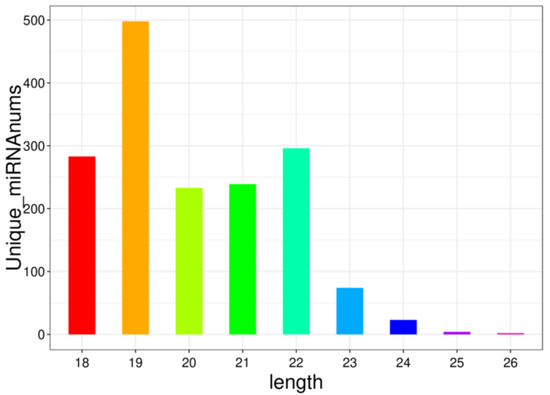 The analyzed data following quality control are presented in Table 2. Further miRNA identification and prediction analysis were conducted on the valid data. A statistical analysis of the identified miRNAs revealed a length distribution primarily within the 18–26 nt range, with the 19 nt length being the most prevalent. This observation aligns with the typical cutting pattern of the Dicer enzyme, further supporting the accuracy of the miRNA sequencing process (Figure 2).
