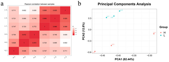 Correlation heat map and PCA clustering map between the two groups. Note: (a) correlation heat map; (b) PCA cluster diagram. H: yak milk-derived exosomes at high altitude; L: yak milk-derived exosomes at low altitude.