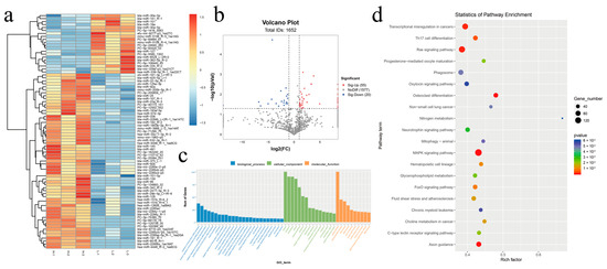 A total of 75 DEMs were identified between the high-altitude and low-altitude yak milk-derived exosome samples, of which 55 were upregulated and 20 were downregulated (Figure 4a,b). To further investigate the biological functions regulated by these miRNAs, their target genes were predicted using both TargetScan and Miranda software. The intersection of these two lists served as the final target gene list, which was then subjected to GO and KEGG enrichment analyses. The analyses revealed significant enrichment in biological processes, such as the positive regulation of transcription in the DNA template, the positive regulation of transcription by RNA polymerase II, and protein phosphorylation. The enriched cellular components included the nucleus, cytosol, and nucleoplasm. The enriched molecular functions included protein binding, identical protein binding, and ATP binding (Figure 4c). Pathway analyses highlighted enrichment in the mitogen-activated protein kinases (MAPK) signaling pathway, the Ras signaling pathway, Th17 cell differentiation, and Axon guidance (Figure 4d).
