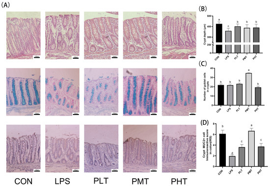 Figure 1. The effect of terpinen-4-ol on the colon morphology and structure of immune-stressed piglets. (A) Colon tissue HE, PAS, and immunohistochemical staining (100× magnification). (B) Depth of crypt. (C) Number of goblet cells. (D) MUC2 positive area. The data are represented as mean ± SD, n = 8. Different letters indicate significant differences (p < 0.05).
