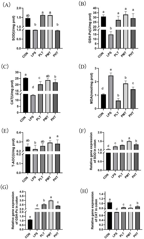 Figure 2. The effect of terpinen-4-ol on the activity and gene expression of antioxidant enzymes in the colon of immune-stressed piglets. (A) SOD enzyme activity. (B) GSH-Px enzyme activity. (C) CAT enzyme activity. (D) MDA enzyme activity. (E) T-AOC enzyme activity. (F) SOD gene expression. (G) GSH-Px gene expression. (H) CAT gene expression. The data are represented as mean ± SD, n = 8. Different letters indicate significant differences (p < 0.05).