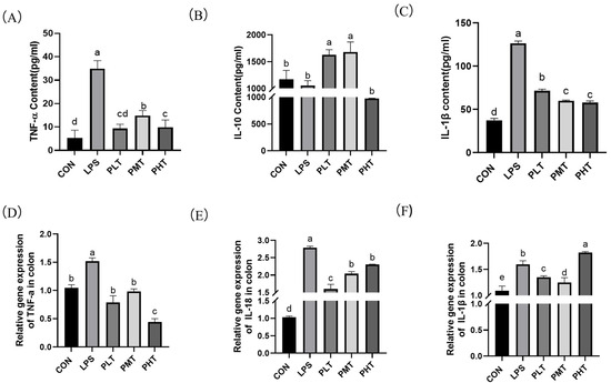 The effects of TER on the cytokine content and gene expression in the colon in immune-stressed piglets are shown in Figure 3. The colonic contents of IL-1β and TNF-α in the LPS group were significantly greater than those in the CON group (p < 0.05), whereas the colonic contents of IL-10 in the LPS group tended to decrease in comparison with those in the CON group (0.05 < p < 0.1). Compared with those in the LPS group, the PLT and PMT groups exhibited a substantial increase in IL-10 (p < 0.05) and a significant decrease in IL-1β and TNF-α (p < 0.05) (Figure 3A–C). The gene expression of cytokines was also measured. Compared with those in the CON group, TNF-α, IL-1β, and IL-18 gene expression in the LPS group significantly increased (p < 0.05). Compared with those in the LPS group, the relative expression levels of the TNF-α, IL-1β, and IL-18 genes in the TER group were significantly lower (p < 0.05) (Figure 3D–F).