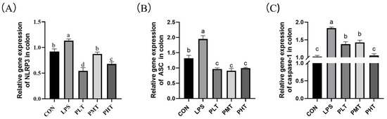 The effects of TER on the gene expression of the NLRP3 inflammasome in the colon of immune-stressed piglets are shown in Figure 4. Compared with those in the CON group, the relative expression of the genes encoding NLRP3, ASC, and caspase-1 in the LPS group increased (p < 0.05). Compared with those in the LPS group, the relative expression of the NLRP3, ASC, and caspase-1 genes in the TER group decreased (p < 0.05) (Figure 4A–C).