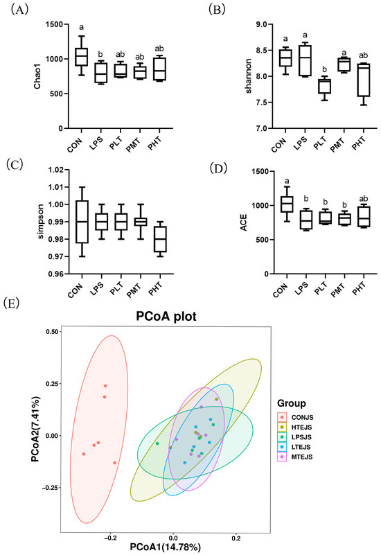 The effects of TER on the alpha and beta diversity of the gut microbiota of the colon in immune-stressed piglets are shown in Figure 5. The inclusion of TER led to an increase in the Chao1 and ACE indices compared with those in the LPS group; in contrast, the CON group showed a decrease in both indices. The Shannon and Simpson indices did not significantly differ across groups (p > 0.05) (Figure 5A–D).