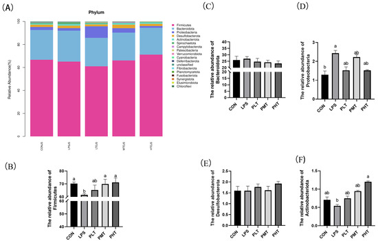 Figure 6. The effect of terpinen-4-ol on the gut microbiota of immune-stressed piglets. (A) Bacterial taxonomy analysis of gut microbiota at the phylum level. (B) Relative abundance of Firmicutes. (C) Relative abundance of Bacteroidota. (D) Relative abundance of Proteobacteria. (E) Relative abundance of Desulfobacteriota. (F) Relative abundance of Actinobacteriota. The data are represented as mean ± SD, n = 8. Different letters indicate significant differences (p < 0.05).