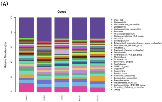 The effects of TER on the bacterial abundance in the colonic mucosa of immune-stressed piglets are shown in Figure 6. In terms of phyla, the three dominant phyla were Firmicutes, Bacteroidetes, and Proteobacteria (Figure 6A). The findings demonstrated that there was a substantial decrease in Firmicute abundance in the LPS group compared with that in the CON group (p < 0.05) (Figure 6B), and the abundance in all TER-treated groups was significantly greater than that in the LPS group. The abundance of the Bacteroidetes phylum tended to decrease with increasing doses of TER (0.05 < p < 0.1) (Figure 6C). There were no discernible differences in the abundances of the other bacteria between the groups (p > 0.05) (Figure 6D–F).