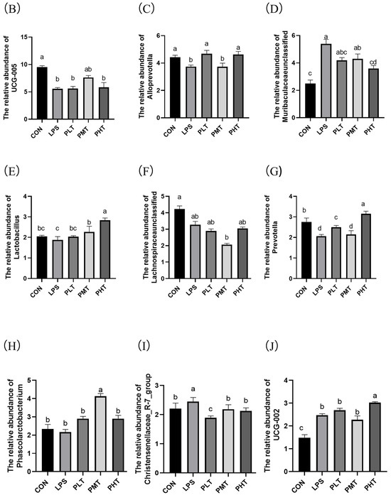 At the genus level, the colonic content included bacterial taxa such as UCG-005, Paraprevotella, unclassified Bacteroidales, Lactobacillus, Christensenellaceae, Prevotella, Collinsella, Christensenellaceae, and UCG-002, among others (Figure 7A). By comparing the LPS group to the CON group, the abundance of UCG-005 was substantially lower (p < 0.05), whereas in the PMT group, it was significantly greater (p < 0.05) (Figure 7B). Compared with the CON group, the abundance of Muribaculaceae_unclassified in the LPS group was significantly elevated, while that in the PHT group was significantly reduced (p < 0.05) (Figure 7D). Compared with the CON group, the abundance of Prevotella in the LPS group was significantly decreased (p < 0.05) (Figure 7G). Compared with the CON group, the abundance of Christensenellaceae_R-7_group in the LPS group was significantly increased, while that in the TER group was significantly decreased (p < 0.05) (Figure 7I). Compared with the CON group, the abundance of UCG-002 in the LPS group was significantly enhanced (p < 0.05) (Figure 7J).