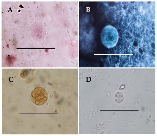In the laboratory, the samples were processed using the sodium acetate-ether stool concentration technique []. Briefly, a small amount of each sample (2–3 g) was homogenised in 30 mL of aceto-acid buffer (an aqueous solution containing 1.5% sodium acetate and 0.36% acetic acid) in 50 mL conical tubes and filtered through a metal sieve to remove large debris. The filtered suspension was transferred to new 50 mL conical tubes, vortexed for 30 s with diethyl ether (1:1 ratio), and centrifuged at 1500 rpm for 2 min. The aqueous sediment (at the bottom of the tubes) was examined microscopically on temporary slides stained with Lugol’s iodine; in some cases, permanent trichromic and Clorazol-black stained slides were prepared from the original sample. Cysts were photographed and measured with an Olympus DP20 camera on an Olympus BX51 microscope (Olympus, Tokyo, Japan). Positive samples from anteater, colobus, and greater rhea were processed at the time of their collection (e.g., in 2009), confirming the presence of four-nucleated cysts, and were subsequently frozen and stored. Recently, with the detection of four-nucleated cysts in other host species, the previously frozen samples were further processed alongside the newly collected positive samples.