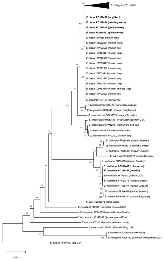 This study focused on the identification of four-nucleated cyst-forming Entamoeba species that were occasionally detected by microscopy at different times between 2009 and 2024, in samples from chimpanzees (Pan troglodytes), mantled guerezas (Colobus guereza), lar gibbons (Hylobates lar), mandrills (Mandrillus sphinx), giant anteaters (Myrmecophaga tridactyla), or greater rheas (Rhea americana) (Table 1). Chimpanzees were housed in separate enclosures delimited by glass panels and covered with nets. Lar gibbons that tested positive included two individuals under quarantine isolation. Mantled guerezas and mandrills were kept in separate enclosures with concrete floors, also delimited by glass panels. Giant anteaters and greater rheas were housed in open-air enclosures with natural soil covered by grass; these enclosures were bordered by metal fences located close to visitor pathways. None of the animals presented clinical signs associated with Entamoeba infections. The anteater that tested positive for Entamoeba experienced intermittent diarrheic episodes, although none occurred at the time of the findings; these episodes were likely caused by a trichomonadid flagellate [].
