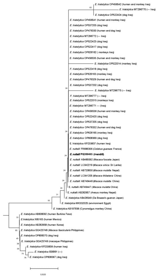The following supporting information can be downloaded at: https://www.mdpi.com/article/10.3390/ani15010090/s1, File S1: Chromatogram obtained after sequencing the PCR amplicon from mandrill samples showing mixed sequences; File S2, Complete list of missidentified Entamoeba nuttalli sequences available I GenBank as of 21 April 2024.