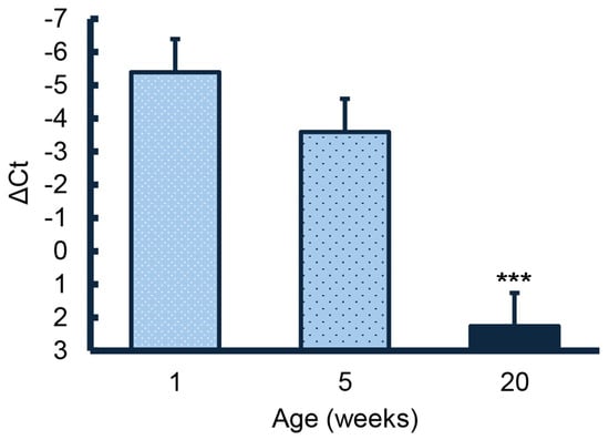 Expression of the HBB gene in the testis decreased with age. Expression in testes from the postpuberal 20-week-old animals was significantly lower (p < 0.001) than expression in testes from 1- and 5-week-old animals (Figure 1). Although expression in testes from 5-week-old animals appeared to be slightly less than expression in testes from1-week-old animals, values did not differ significantly.