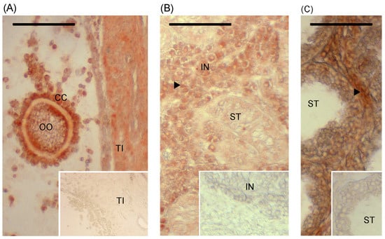 Immunolabelling of HBB protein in porcine ovary (A) and in testes from 6.5-week-old boar (B) and 24-week-old boar (C). The OO indicates a section of the oocyte located in the follicle with labelling detected in oocyte, cumulus cells (CCs), and lighter labelling in theca interna (TI). One of the testicular seminiferous tubules is indicated by ST in (B,C) and immunolabelling of interstitial tissue (IN) is indicated with an arrowhead. Insets represent the negative (normal serum) controls, and bars represent 100 μm.