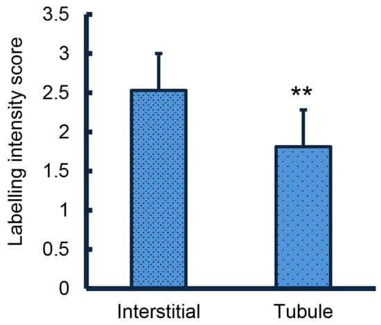 Immunolabelling of HBB was readily detectable in the porcine ovary used as a positive control. The oocyte, cumulus, and granulosa cells were labelled, as indicated by comparison with the negative control (Figure 2A). Immunolabelling of HBB in young (Figure 2B) and postpuberal (Figure 2C) testes was observed with labelling clearly present in the interstitial space compared with the negative control. The intensity of labelling within the tubules was not affected by age nor was the intensity of labelling in the interstitial space affected by age, although the labelling intensity score was numerically higher in the younger animals on average (2.8 vs. 2.4, SE =0.6; p = 0.3). The intensity of labelling was higher in the interstitial space than within the seminiferous tubules (p < 0.01; Figure 3). This difference between interstitial tissue and the tubular compartment was also observed when juvenile and postpuberal boars were analyzed separately. Treatment with the aromatase inhibitor, letrozole, which prolongs the first wave of Sertoli cell proliferation beyond 5 weeks of age, did not affect the HBB labelling intensity of the interstitial space (2.8 vs. 2.6, SE = 0.5) or within the seminiferous tubules ((2.0 vs. 1.8, SE = 1.0).