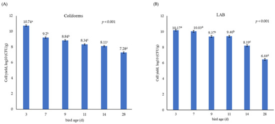 Effect of bird age on the population density of bacteria. (A) Coliforms and (B) lactic acid bacteria (LAB). Data are presented as mean ± standard error. Values with different superscripts (a–d) are significantly different (p < 0.001).