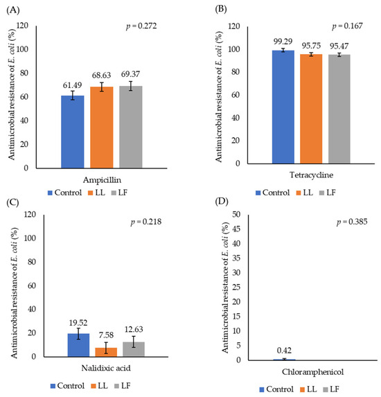 The effect of administration of either Lactococcus lactis (LL) or Lactobacillus fermentum (LF) on the proportion of isolates of E. coli that were resistant to different antimicrobials (20 µg/mL). (A) ampicillin, (B) tetracycline, (C) nalidixic acid, and (D) chloramphenicol.