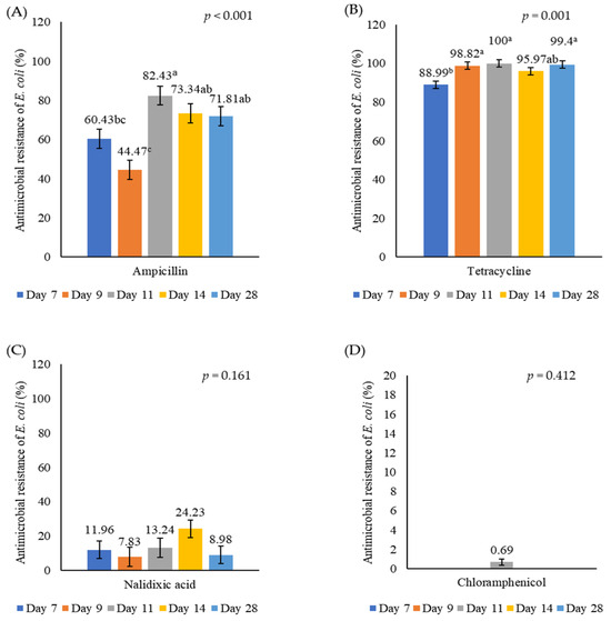 The percentage of E. coli isolates taken from birds of different ages (days of life) that were resistant to different antimicrobials. (A) Ampicillin, (B) tetracycline, (C) nalidixic acid, and (D) chloramphenicol. Values with different superscripts (a–c) are significantly different (p < 0.05).