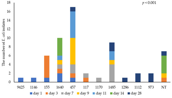 One of the purposes of whole-genome sequencing is to identify the clonality of the strains and MLST and deduced O antigen type. The greatest diversity of E. coli strains was associated with the bird age. MLST 457 (O11:H15) was the most common type that was identified, followed by MLST 1640 (O124/O164:H25) and 1485 (O83:H42), particularly during the starter phase. However, little is known about the association between the carriage of virulence genes and MLST in E. coli isolates as birds age, while many studies have demonstrated the association between certain MLST E. coli strains and poultry colibacillosis [31,32,33]. Pires-dos-Santos et al. [34] reported that ST 95 was mostly observed in extraintestinal pathogenic Escherichia coli (ExPEC) isolates in both human and poultry infections. This was followed by ST 131, ST 420 and ST 648, which were related to urinary tract infections (UTIs) in humans. Colibacillosis observed in chickens aged between three and ten weeks was associated with the O1, O2 and O78 serogroups of E. coli [35,36,37]. In the present study, these serotypes and serogroups were not observed; instead, MLST 457, 1640, 1485, and 155 were common during the starter phase. New MLST 973, 1112 and 1286 were observed only on day 28, reflecting the diversity and evolution of E. coli as the birds aged.