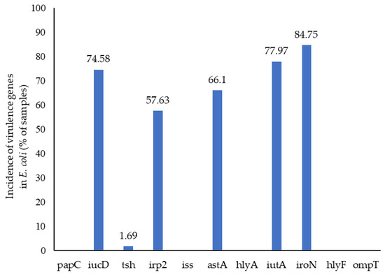 Most E. coli strains are commensal and are adapted to survive in the intestine, and E. coli are regularly studied as a representative indicator of AMR and virulence [1,2]. Specific strains of antimicrobial-resistant (AMR) E. coli carry virulence factors and may lead to a variety of infections in humans and in animals [3,4]. Many virulence-associated genes (VAGs) have been associated with infection and colibacillosis in poultry [5,6,7]. A variety of VAGs have also been implicated in causing extraintestinal diseases such as septicaemia, air sacculitis, and cellulitis, peritonitis and salpingitis in birds [8,9].