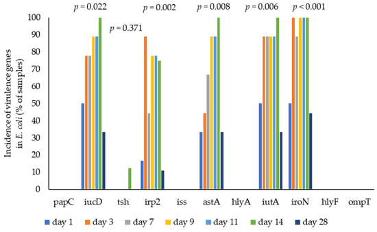 The pathotype of E. coli strains can be determined by the variety of VAGs they carry. However, the determination of what characterises APEC is a matter of debate [38,39]. Johnson et al. [40] identified as minimal predictors of APEC the carriage of iutA, hlyF, iss, iroN and ompT genes. In the present study, a large number of potential virulence genes were identified by WGS analysis. Genes associated with iron uptake and sequestration were very prevalent in E. coli isolates. This would suggest that these characteristics might confer a clear selective advantage to strains carrying these genes. Young chickens are particularly susceptible to APEC, but the declining prevalence of virulence factors in E. coli by day 28 might indicate that, as observed in the earlier experiment [14], commensal E. coli proliferates and outcompetes the APEC strains as the birds grow older. This finding supported the hypothesis that the prevalence of pathogenic coliforms decreased as birds aged. VAGs carrying E. coli might originate from the hatchery [41,42], and a move to hatching the egg at the production facility could reduce infection, as it would reduce the risk of infection from the hatchery and haulier.