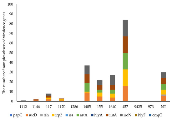 The association between MLST and virulence genes in E. coli isolates. NT: MLST not identified.