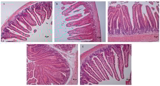 The pathological section of jejunum of 36 d rabbits (original magnification 200×). (A) Con group; (B) 0.3% Arg group; (C) 0.6% Arg group; (D) 0.03% NCG group; (E) 0.06% NCG group. Bar = 50 μm.