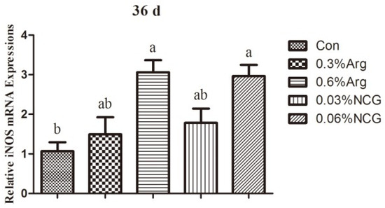 Effects of dietary arginine or N-carbamylglutamate (NCG) supplementation on the mRNA expressions of iNOS in the jejunum of 36-day-old young rabbits. Note: Columns with different letters differ significantly (p < 0.05). Data are presented as mean ± standard error (SE) (n = 8). This is the same for Figure 3 and Figure 4.