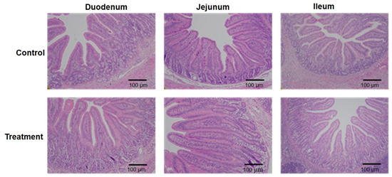 Intestinal morphology of IUGR pigs fed the basal diet supplemented with unfermented milk (control) or fermented milk (treatment). Cross-sections of the small intestine were H&E-stained and then examined under a microscope at 100× magnification.