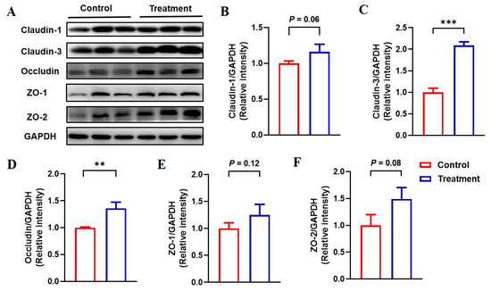 Expression of tight junction proteins in the jejunum of IUGR pigs fed the basal diet supplemented with unfermented milk (control) or fermented milk (treatment). Representative tight junction proteins in the intestine were quantified using Western blot analysis. (A) Western blot results of claudin-1, claudin-3, occludin, ZO-1, ZO-2, and GAPDH protein expression. (B–F) The expression of claudin-1 (B), claudin-3 (C), occludin (D), ZO-1 (E), and ZO-2 (F) relative to GAPDH. Data are analyzed with an unpaired t-test and expressed as the means ± SD, n = 6 per group. ** p < 0.01 and *** p < 0.001.