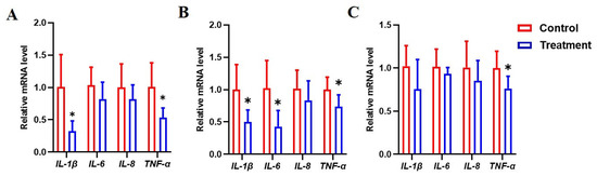 Expression of cytokine genes in the intestine of IUGR pigs fed the basal diet supplemented with unfermented milk (control) or fermented milk (treatment). The expression of proinflammatory cytokines in the duodenum (A), jejunum (B), and ileum (C) was determined using qPCR analysis. Data are analyzed with an unpaired t-test and expressed as means ± SD, n = 6. * p < 0.05.