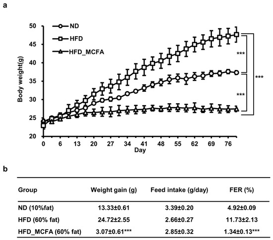 We evaluated the effects of BSFL-MCFAs on weight gain in mice. Mice in the HFD group showed the greatest increase in body weight, whereas the weight gain was significantly attenuated in the HFD_MCFA group (Figure 1). Notably, the weight gain in mice in the HFD_MCFA group was lower than that in the ND group. The highest daily food intake was observed in the ND group, with no significant difference in food intake between the HFD and HFD_MCFA groups (Figure 1b). On the basis of these findings, we calculated the FER for each group. The FER in the HFD_MCFA group was lower than that in the ND and HFD groups (Figure 1b). These results demonstrate that BSFL-MCFAs may help suppress weight gain in HFD-fed mice.