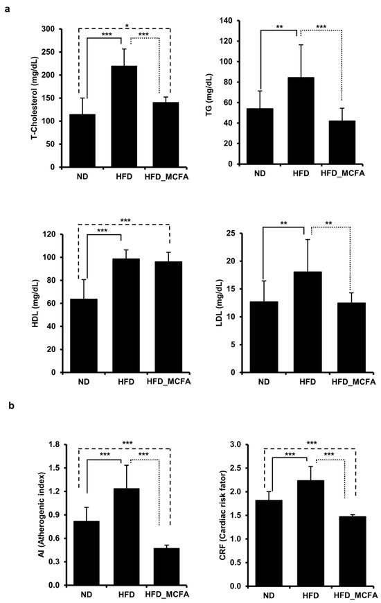 Obesity is known to be associated with increased TC, TG, and LDL levels in the blood, which are established risk factors for metabolic disorders and cardiovascular diseases [86]. Accordingly, preventing obesity is a well-established strategy to improve lipid profiles and to reduce cardiovascular risk. In this study, significantly lower TC (Cohen’s d value: 2.97, effect-size r: 0.83), TG (Cohen’s d value: 1.26, effect-size r: 0.53), and LDL (Cohen’s d value: 1.30, effect-size r: 0.0.55) levels were observed in the HFD_MCFA group than in the HFD group (Figure 2). Additionally, the AI and CRF in the HFD_MCFA group were also lower than those in both the ND and HFD groups. Interestingly, HDL levels were elevated in both the HFD and HFD_MCFAs groups. This may reflect a compensatory response to high-fat intake, as increased HDL is often observed in rodent models fed high-fat diets [87]. In particular, MCFAs have been reported to promote HDL biosynthesis and improve reverse cholesterol transport by enhancing hepatic expression of apolipoproteins and lipid transporters [88,89]. These observations are consistent with previous reports indicating the lipid-lowering effects of MCFAs in animal models [90,91,92], and are further supported by recent meta-analysis report showing that MCFA-enriched diets contribute to reduced body weight, improved lipid profiles in blood, and decreased insulin resistance in overweight or obese individuals [93]. Therefore, these results imply that the significantly lower levels of TC, TG, and LDL in the HFD_MCFA group may be closely associated with the attenuated weight gain caused by the inhibition of body fat accumulation.