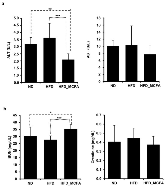 An HFD can induce metabolic changes that lead to liver and kidney injury, as evidenced by alterations in serum biomarkers such as AST, ALT, BUN, and creatinine [55,56,57,58,59,60]. Therefore, we analyzed these markers to investigate the effects of MCFAs on the liver and kidney functions in HFD-fed mice. The results showed no significant increase in AST, ALT, BUN, or creatinine levels in the HFD group compared to those in the ND group (Figure 3). Interestingly, ALT levels in the HFD_MCFA group were significantly lower than those in the ND and HFD groups, suggesting a potential protective effect of MCFAs on liver function (Figure 3a). Additionally, although the HFD_MCFA group exhibited a significant increase in BUN levels compared with the HFD group, no significant difference was observed between the ND and HFD_MCFA groups (Figure 3b). These findings demonstrate that BSFL-MCFAs may exert differential effects on serum biomarkers associated with liver and kidney functions in HFD-fed mice, particularly by reducing ALT levels.