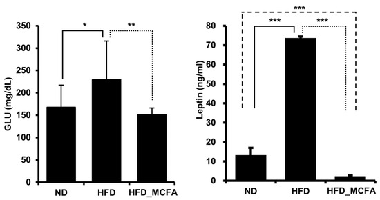 Animal experiments have elucidated the relationship between an HFD and increased serum glucose, and the relationship between obesity and increased serum glucose levels has been reported [61,62,63,64,65]. Therefore, we measured blood glucose and leptin levels to examine the effect of MCFAs on obesity. Significant increases in the blood glucose and leptin levels were observed in the HFD group. In contrast, the blood glucose and leptin levels in the HFD_MCFA group were significantly lower than those in the HFD group (Figure 4). Furthermore, lower leptin levels were observed in the HFD_MCFA group than in the ND group. These results suggest that BSFL-MCFAs may help prevent HFD-induced obesity.