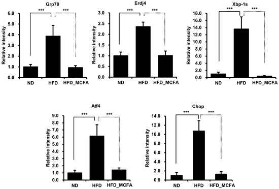 Several studies have reported that hypothalamic ER stress is closely associated with obesity and leptin resistance [66,67,68,69,70,71,72]. Therefore, we investigated changes in the expression of ER stress markers, such as Grp78, Erdj4, Xbp-1s, Atf4, and Chop, in the hypothalamus. The mRNA levels of ER stress markers were significantly increased in the HFD group, implying that the increase in body weight in HFD-fed mice was associated with obesity (Figure 5). In contrast, we observed decreased mRNA levels of ER stress markers in the HFD_MCFA group, suggesting the prevention of obesity by MCFAs (Figure 5). These findings indicate that BSFL-MCFAs may exhibit anti-obesity effects in HFD-fed C57BL/6J mice.