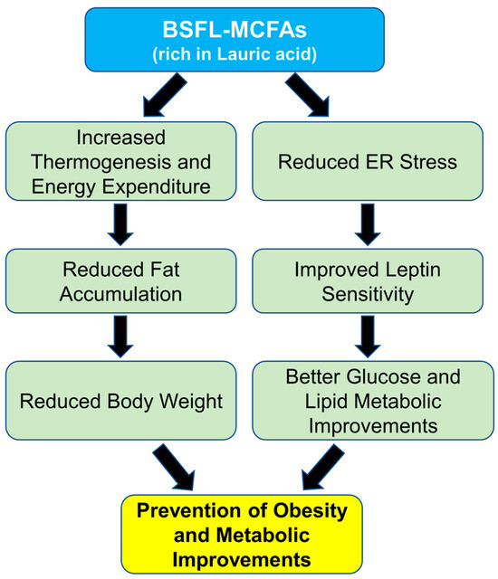 In this study, we found that supplementation with BSFL-MCFAs was associated with improvement in several obesity-related metabolic parameters in mice fed HFD. Lauric acid (C12;0), the predominant MCFA in BSFL crud lipids, may have contributed to these effects through its known metabolic properties. The HFD_MCFA group showed reduced serum glucose (Cohen’s d value: 1.28, effect-size r: 0.54) and leptin (Cohen’s d value: 112.89, effect-size r: 0.99) levels compared to the HFD group, which may reflect improvements in glucose regulation and metabolic hormone balance (Figure 4). In addition, gene expression analysis revealed that BSFL_MCFAs intake was accompanied by decreased expression of several ER stress markers, including Grp78, Erdj4, Xbp-1s, Atf4, and Chop, suggesting a potential reduction in HFD-induced ER stress (Figure 5). MCFAs, including lauric acid, have been reported to attenuate ER stress via modulation of the PERK-eIF2α-ATF4 pathway [96,97]. ER stress has been implicated in metabolic dysfunctions associated with obesity, including insulin resistance, leptin resistance, and chronic inflammation in adipose and hepatic tissues [66,69,98,99,100,101,102]. Specifically, ER stress can impair leptin signaling by activating the SOCS3 pathway and suppressing JAK2-STAT3 signaling, leading to leptin resistance [103,104]. The lower expression of Chop and Atf4, in particular, may demonstrate a downregulation of stress pathways related to the PERK-eIF2α axis, which is known to mediate cellular stress and inflammatory signaling [105,106]. Interestingly, the leptin levels in the HFD-MCFA group were not only lower than those in the HFD group but also the significantly reduced compared to the ND group. While this finding may suggest that BSFL-MCFAs enhance leptin sensitivity or energy expenditure, further investigation is needed to clarify the underlying mechanisms, in potential effects on thermogenesis or metabolic rates. Furthermore, the reduced weight gain observed in the HFD_MCFA group likely reflects fat mass loss rather than muscle catabolism, as indicators of muscle damage (AST) and renal function (creatinine) remained stable across groups (Figure 3). Overall, the results suggest that BSFL-MCFAs supplementation may contribute to metabolic improvements in the context of diet-induced obesity, possibly through modulating ER stress and related endocrine responses. However, further studies are necessary to reveal these findings and to explore the mechanistic pathways involved, particularly those linking ER stress with systemic metabolic regulation (Figure 6).