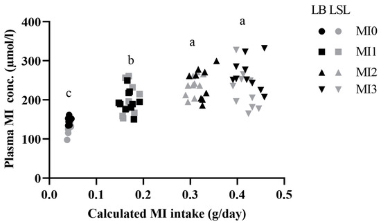 Association between calculated daily myo-inositol (MI) intake (g/day) and MI concentration in plasma (µmol/L) of Lohmann Brown-Classic (LB) and Lohmann LSL-Classic (LSL) laying hens at 4 different levels of MI supplementation. Each group contained 20 hens (10 per strain). MI0 contained 0 g supplemented MI/kg of feed, MI1 contained 1 g supplemented MI/kg of feed, MI2 contained 2 g supplemented MI/kg of feed, and MI3 contained 3 g supplemented MI/kg of feed. The comparisons of treatments were performed using the MIXED procedure using the software package SAS (p < 0.001). Different lowercase letters indicate significant differences among diet groups (p < 0.01).
