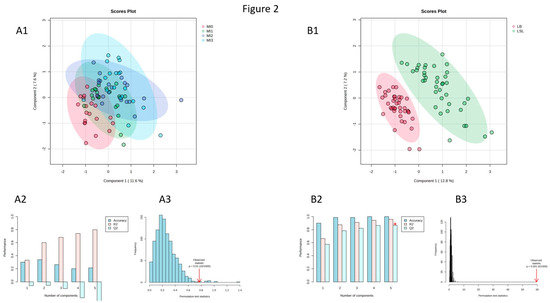 Partial Least-Squares Discriminant Analysis two-dimensional scores plots for the 4 diet groups, irrespective of strain (A1) and irrespective of diet (B1) (reduced data set without phosphatidylcholines, lysophosphatidylcholines, and sphingomyelins), including cross-validation (A2,B2 (* represents maximum quality assessment statistic (Q2))) and permutation test (A3,B3). MI0 = no myo-inositol (MI) supplementation, MI1 = 1 g MI/kg feed, MI2 = 2 g MI/kg feed, MI3 = 3 g MI/kg feed; LSL = Lohmann LSL Classic; LB = Lohmann Brown-Classic.