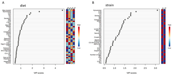 Variable importance in projection (VIP) scoring for the identification of metabolites differentiating groups according to diets (A) and strains (B). Reduced data set without phosphatidylcholines, lysophosphatidylcholines, and sphingomyelins. MI0 = no myo-inositol (MI) supplementation, MI1 = 1 g MI/kg feed, MI2 = 2 g MI/kg feed, MI3 = 3 g MI/kg feed; LSL = Lohmann LSL Classic; LB = Lohmann Brown-Classic.