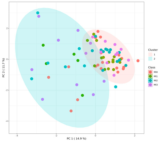 K-means cluster (KMC) analysis, including all hens of both strains and four dietary groups, resulted in two clusters (KMC1, KMC2). 1 = Cluster KMC1 (n = 59) included 32 = Lohmann Brown-Classic (LB) and 27 Lohmann LSL Classic (LSL) hens; from diets: MI0 16, MI1 15, MI2 14, MI3 14 hens. 2 = Cluster KMC2 (n = 21) included 8 LB and 13 LSL hens, from diets: MI0 4, MI1 5, MI2 6, MI3 6 hens. Reduced data set without phosphatidylcholines, lysophosphatidylcholines, and sphingomyelins. MI0 = no myo-inositol (MI) supplementation, MI1 = 1 g MI/kg feed, MI2 = 2 g MI/kg feed, MI3 = 3 g MI/kg feed.