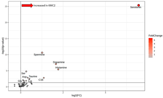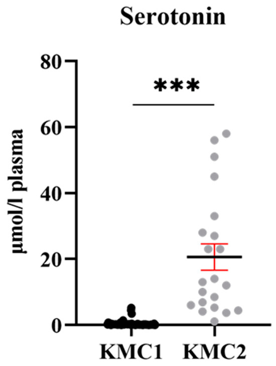 Two clusters were obtained by K-means clustering analysis, KMC1 and KMC2, irrespective of diets and strains. KMC1 consisted of 59 hens, whose metabolite profiles were very similar; KMC2 consisted of 21 hens, whose metabolite profiles very more variable (Figure 4). Analyzing the statistical differences between KMC1 and KMC2 by volcano plot revealed 13 metabolites highly (at least p ≤ 0.01) or slightly (at least p ≤ 0.05) significantly different, Ala, aspartate (Asp), glutamate (Glu), Lys, Ser, dopamine, histamine, serotonin, spermidine, spermine, taurine, C16 and sum of AA (Figure 5, Table 2). The most prominent difference between KMC1 and KMC2 was based on serotonin concentrations (Figure 6). While KMC1 had very low plasma serotonin concentrations in all hens of this cluster, KMC2 hens expressed a huge variation in their serotonin concentrations up to about 60 µmol/L. Plasma dopamine concentrations were only measurable in KMC2 cluster hens (Table 2).
