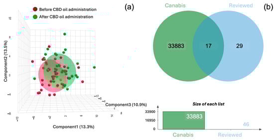 A 3D scatter plot (a) depicts the spatial distribution of data from two groups of cats: red dots represent samples collected before CBD oil administration while green dots represent samples collected after administration. Overlapping regions between the two groups suggest shared characteristics or similar proteomic profiles. A Venn diagram (b) compares two datasets: 33,900 proteins labeled “Cannabis” (green) and 46 CBD-associated proteins identified from reviewed entries in the UniProt Swiss-Prot database as of 1 January 2025 (blue). Seventeen proteins were found to be common between the two datasets. A bar chart below the Venn diagram illustrates the relative sizes of each dataset.