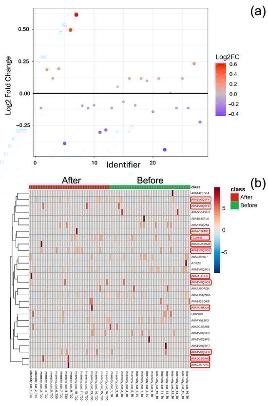 Proteins with a Log2 Fold Change (FC) greater than 1.0 are considered upregulated (red dots) while those with a Log2 FC less than −1.0 are downregulated (blue dots). The analysis revealed 12 upregulated and 15 downregulated proteins at FC 1.0 (a). Heatmap illustrating the expression levels of proteins before and after treatment. Red indicates upregulation while blue indicates downregulation. Twelve proteins (indicated by red circles) showed significant upregulation following treatment (b).